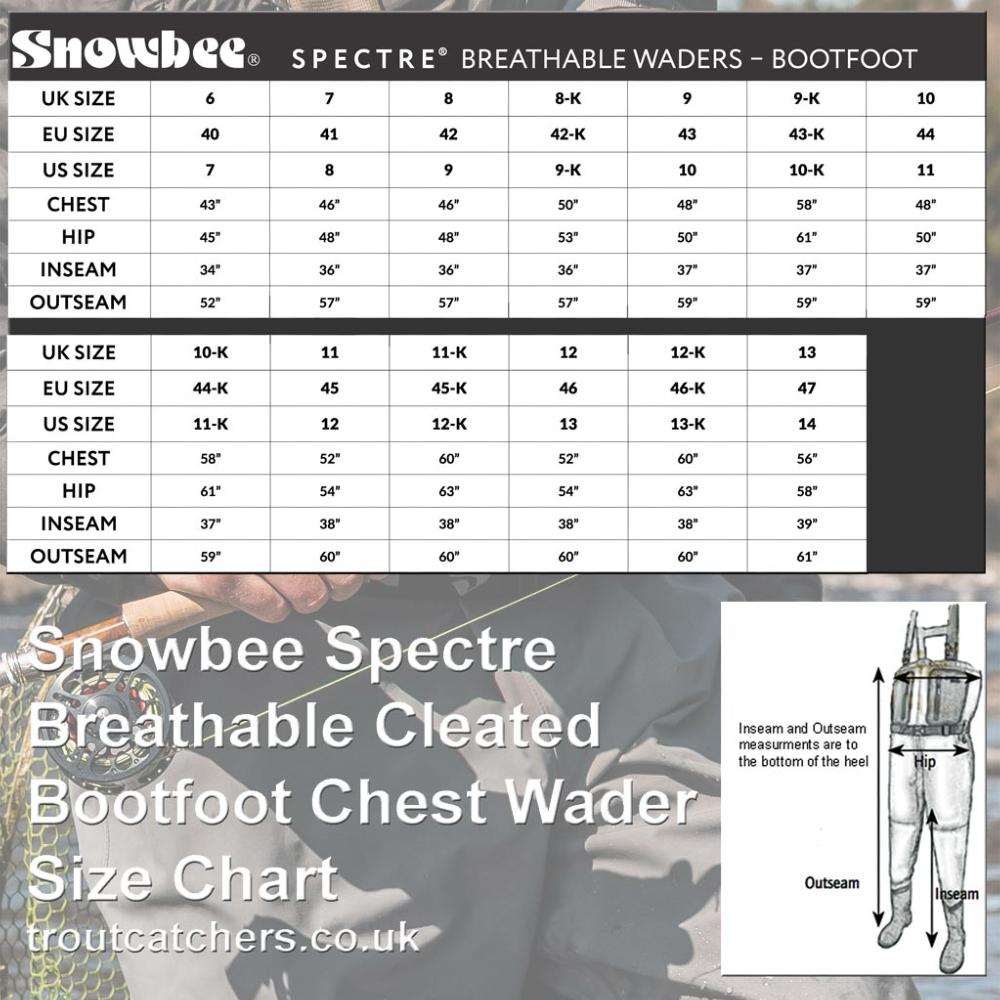 • For boot size, take into account thick wading socks; you may want to go up a size (UK sizes).