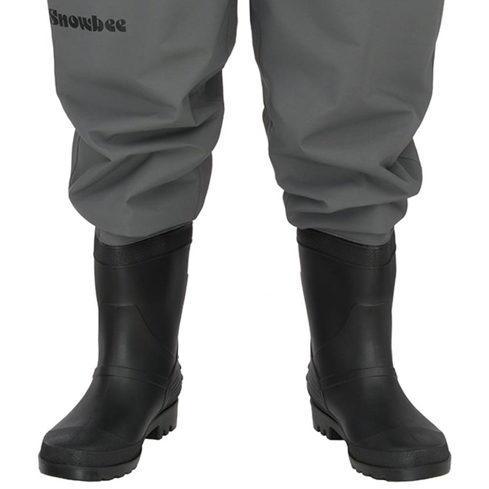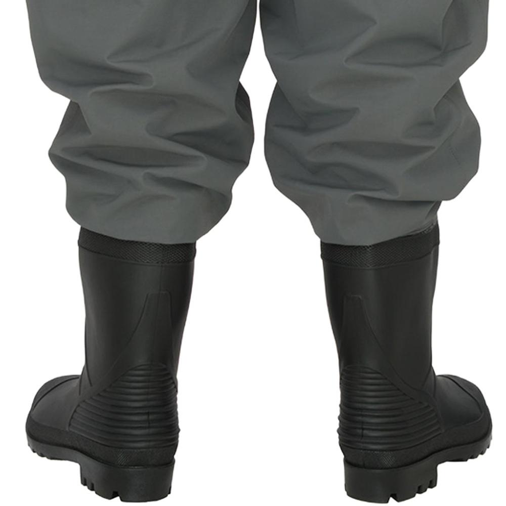 • Cleated Bootfoot Design: Featuring PVC moulded boots (PVC stands for Polyvinyl Chloride, a tough, waterproof plastic) with a deep, cleated sole, these boots provide maximum traction. The cleats dig into grass, mud, or gravel, giving you a solid, stable footing on uneven surfaces, so you can stay confident and safe on your fishing trips.