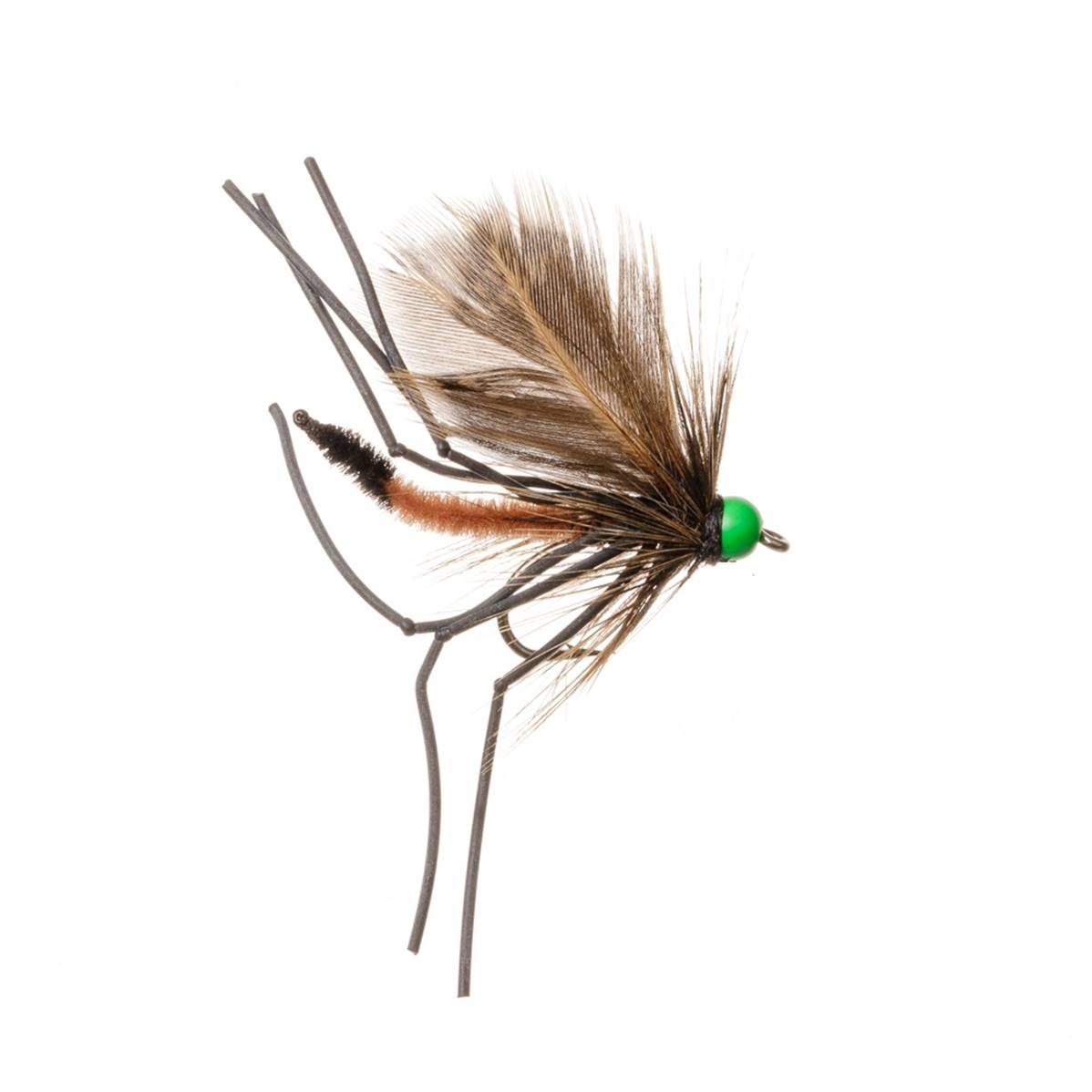 The Tungsten Chartreuse Daddy Long Legs fly imitates the crane fly, particularly during its adult stage when it is most vulnerable. This fly is designed to mimic the long, slender legs and buoyant body of the crane fly, which often skims the water's surface. During late summer and early autumn, crane flies emerge in large numbers, making them a significant food source for trout. Fish target these insects due to their abundance and ease of capture as they struggle on the water's surface. The chartreuse colour and tungsten bead help the fly stand out and sink slightly, mimicking the natural movement of a struggling crane fly.